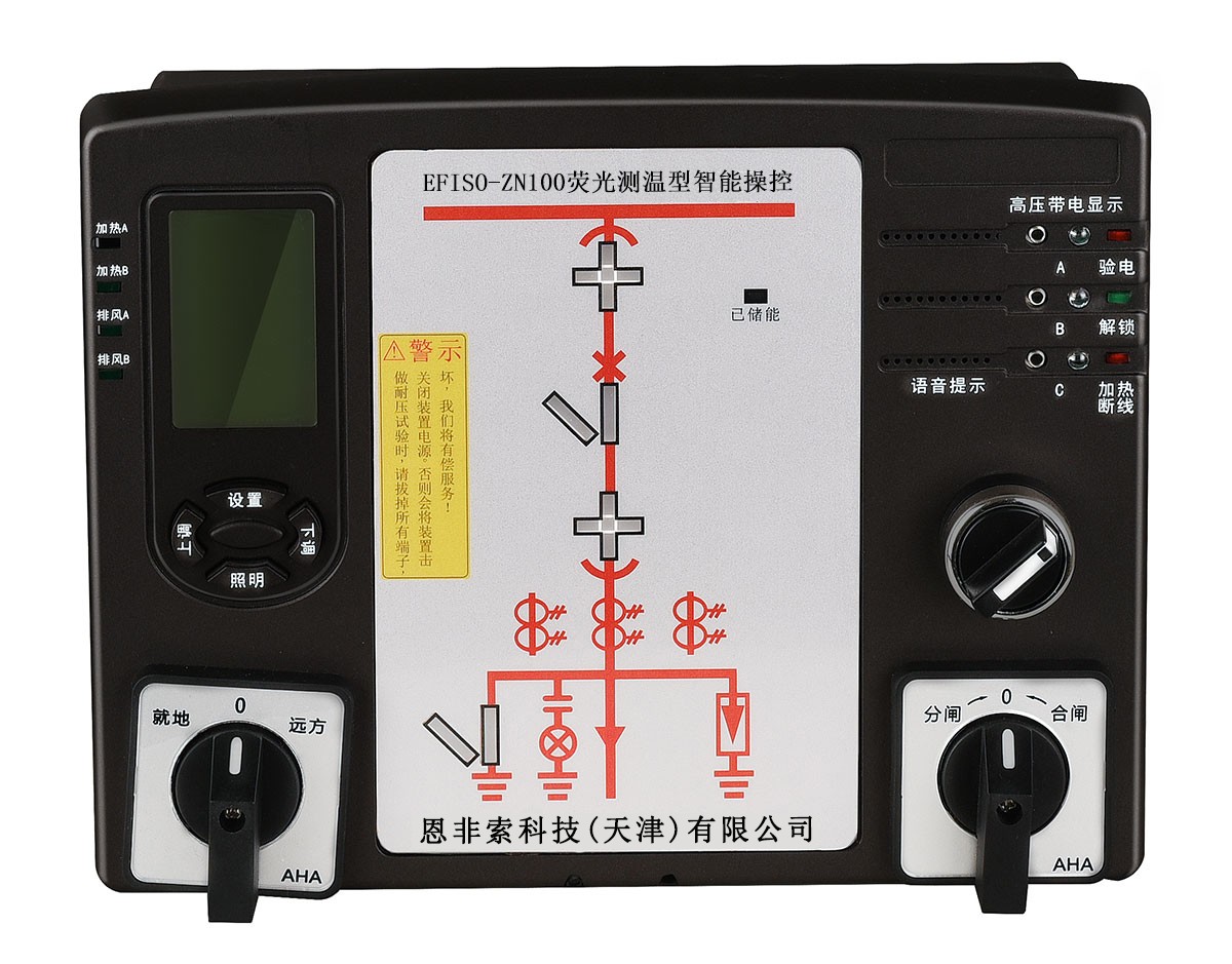 “EFISO-ZN100熒光測溫型智能操控”設備,將傳統智能操控設備和熒光光纖測溫系統一體化,解決了傳統的無線測溫型智能操控裝置,更精準的對開關柜觸頭、電纜頭實時測溫,熒光光纖測溫系統具有抗干擾、耐高壓絕緣、防潮、防塵、防震動,溫度靈敏,使用壽命長等優點。熒光測溫將采集溫度顯示在智能操控的顯示屏上,一體化后,通過智能操控通訊至監控后臺。