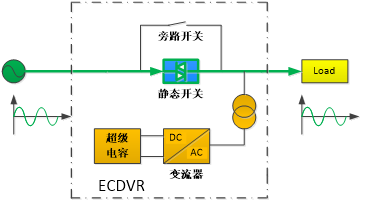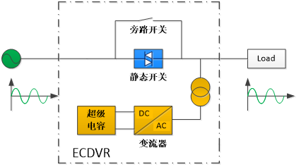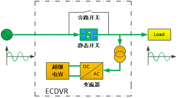 ECDVR動態電壓恢復器是一款針對電壓暫降(晃電)治理的電壓補償裝置,主要由旁路開關、靜態開關、變流器、變壓器及超級電容組成,利用超級電容的快充快放的優勢,可瞬間補償快速跌落的電壓,保證負荷電壓穩定在正常狀態,有效的保證了負荷的安全、穩定的運行,避免電壓暫降對客戶造成重大損失。
