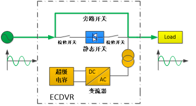 當ECDVR檢測到設備有故障或者在ECDVR逆變供電期間,儲備電能不足時,ECDVR會控制旁路接觸器閉合,由電網直接向負載供電,如果設備發生故障,可以通過檢修開關對設備進行維護,簡單方便,安全可靠。